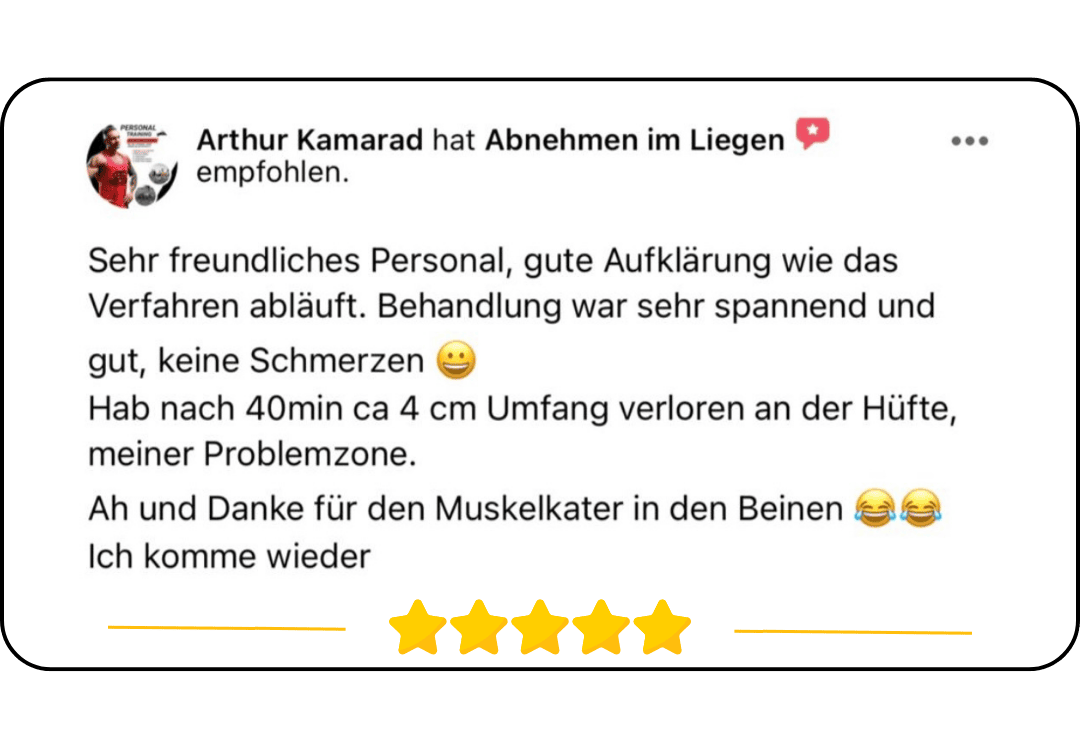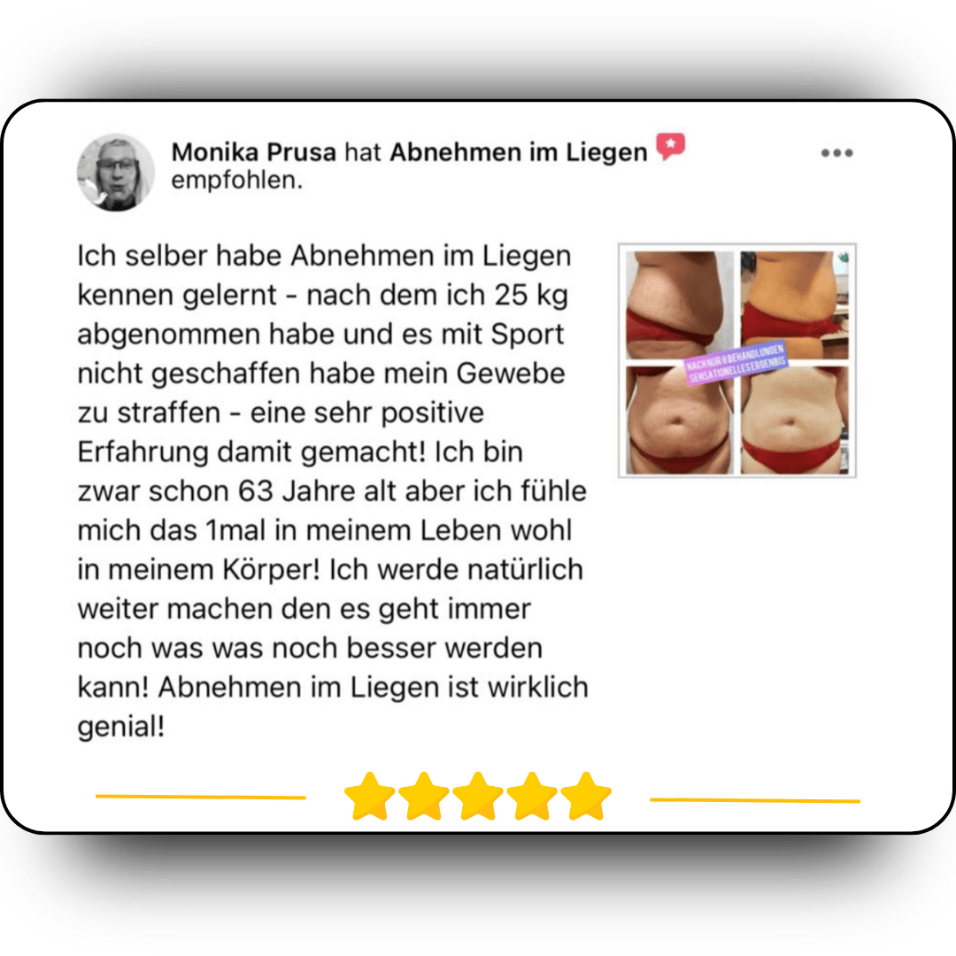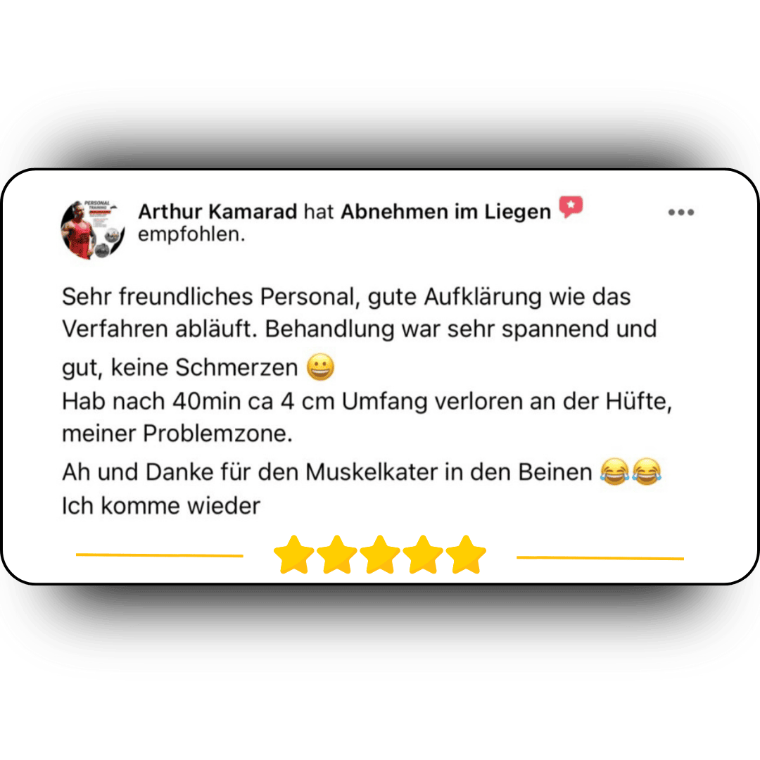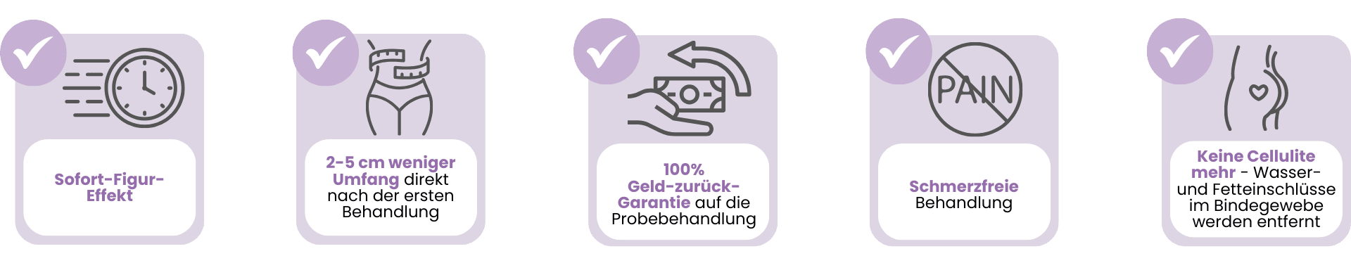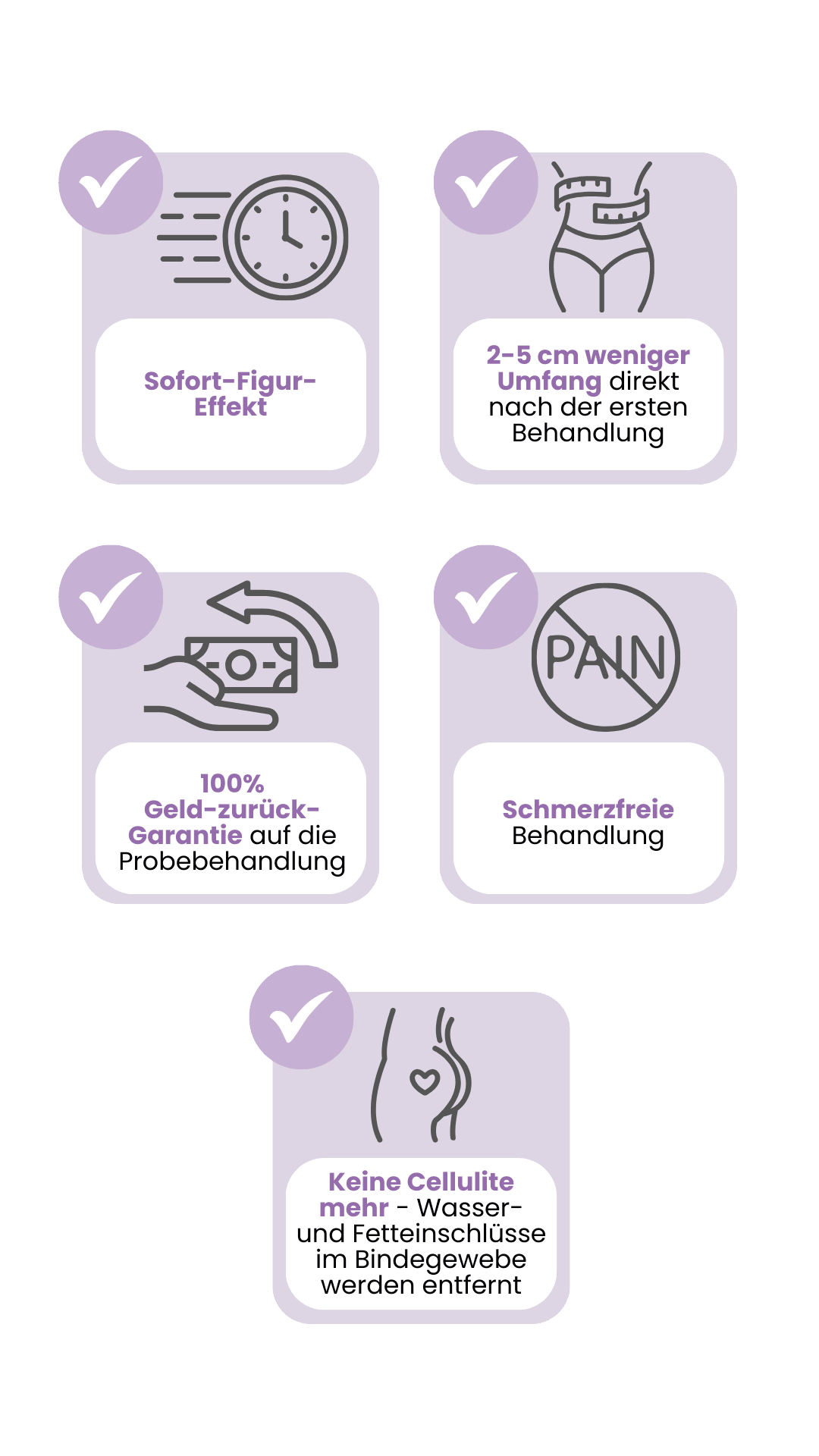 Bereits nach der ersten Behandlung verlierst du 2-5 cm deines Körperumfangs. Du glaubst uns nicht? Kein Problem! Sollte dieses Ergebnis nicht eintreffen, erhältst du dank der 100%-Geld-Zurück-Garantie den vollen Preis der Probebehandlung zurück erstattet. Somit besteht für dich absolut kein Risiko.